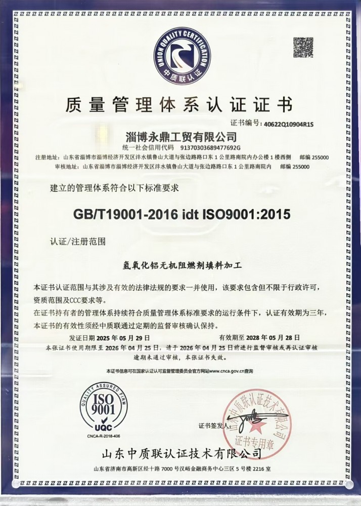质量管理体系认证证书-淄博永鼎工贸有限公司