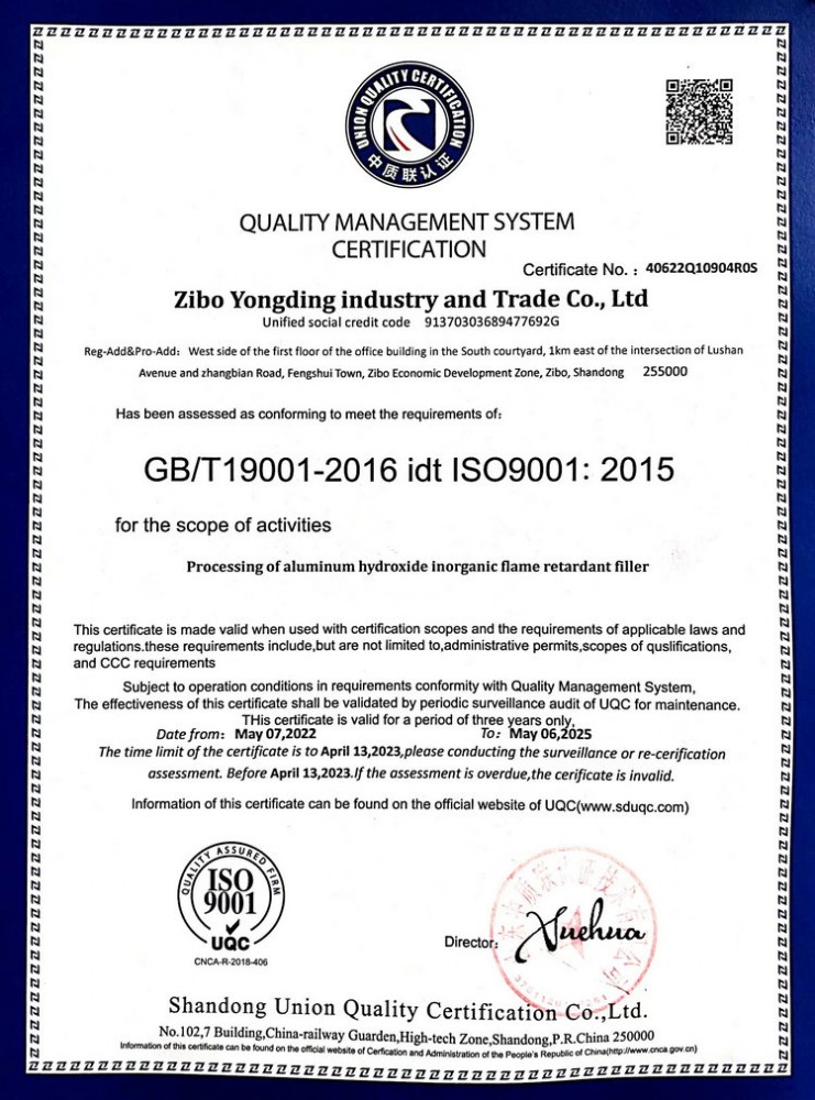 质量管理体系认证证书-英文-淄博永鼎工贸有限公司